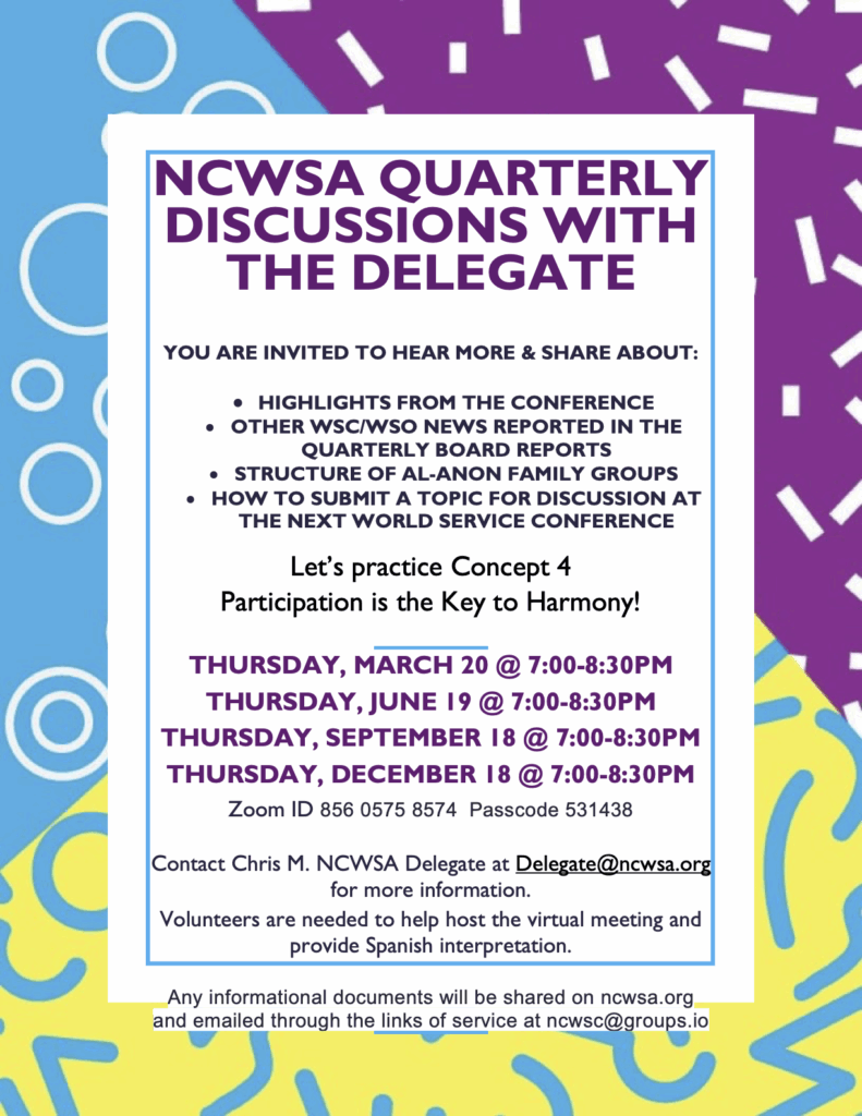 Our Northern California Area Delegate to the World Service Conference, Chris M, holds open Zoom meetings once every quarter to discuss topics of general interest to the membership. These meetings are a great way to stay informed about what’s happening at the Area (and World Service) level. See this flyer for dates, time, and Zoom link.